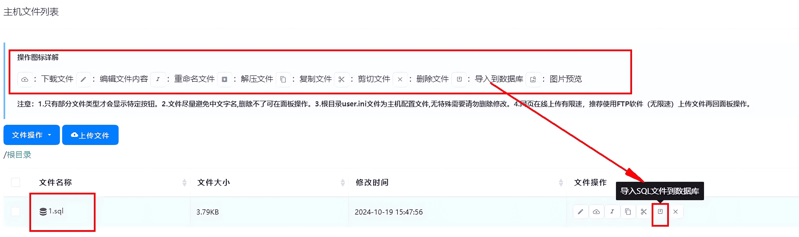 第一种:上传数据库文件到主机文件列表,上传后通过面板按钮导入,部分文件会有操作提示按钮。