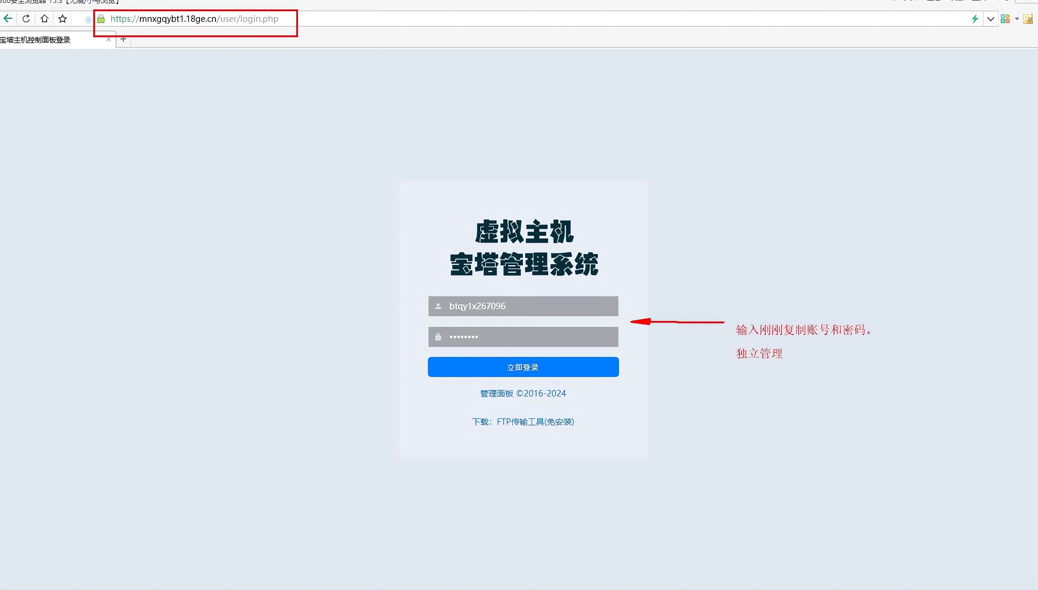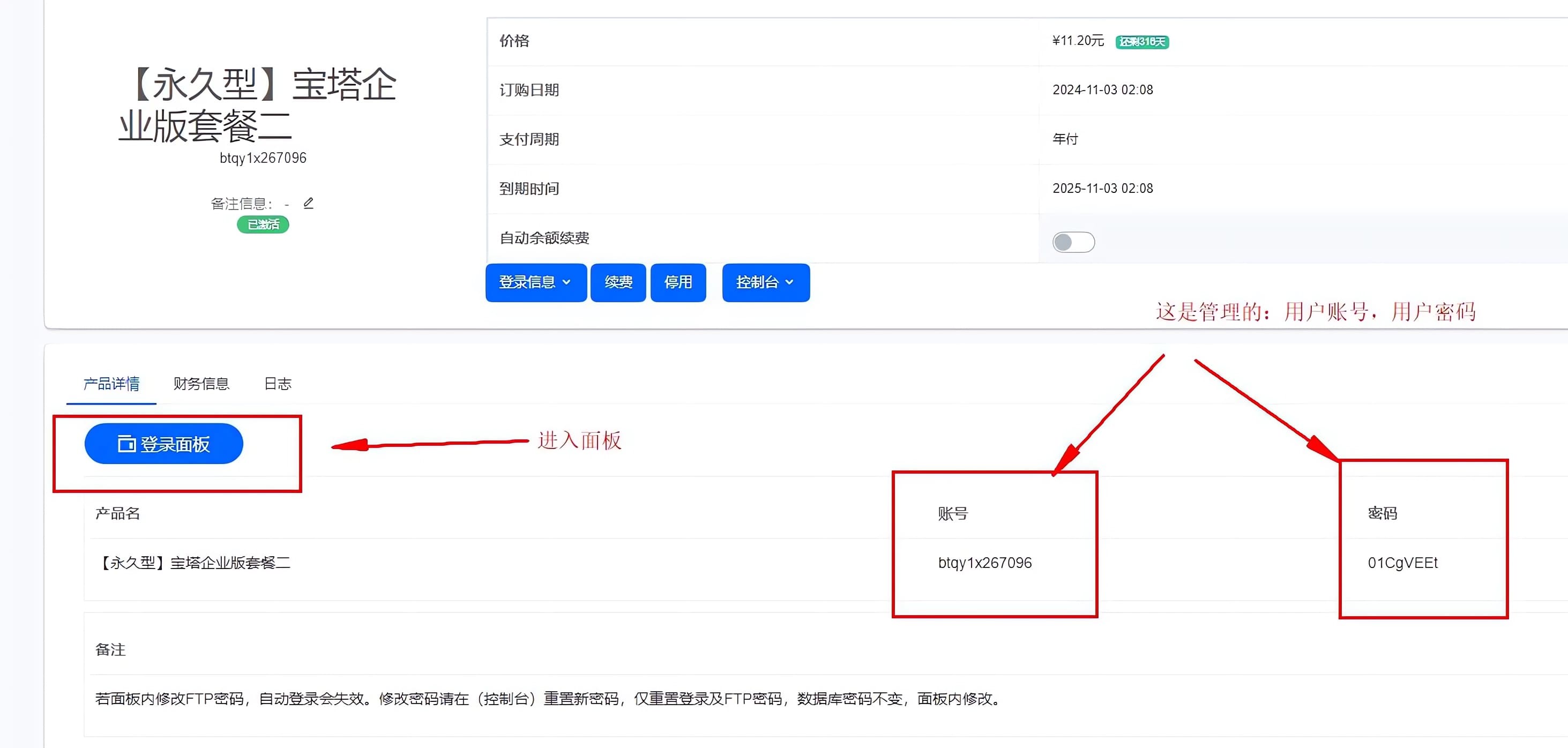第二步:复制账号信息,这个是独立的控制面板登录的信息,接着点击登录面板。
