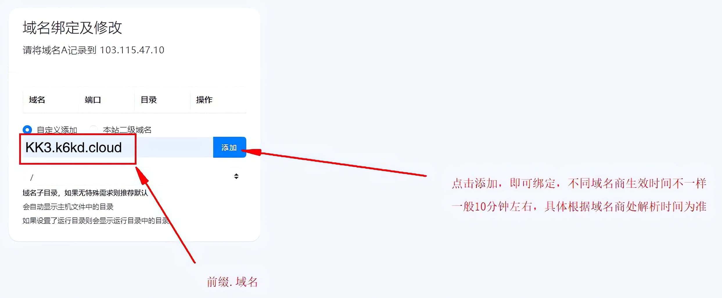 6.进入虚拟主机面板,选择自定义添加,填入域名平台处添加的域名。如:kk3.k6kd.cloud