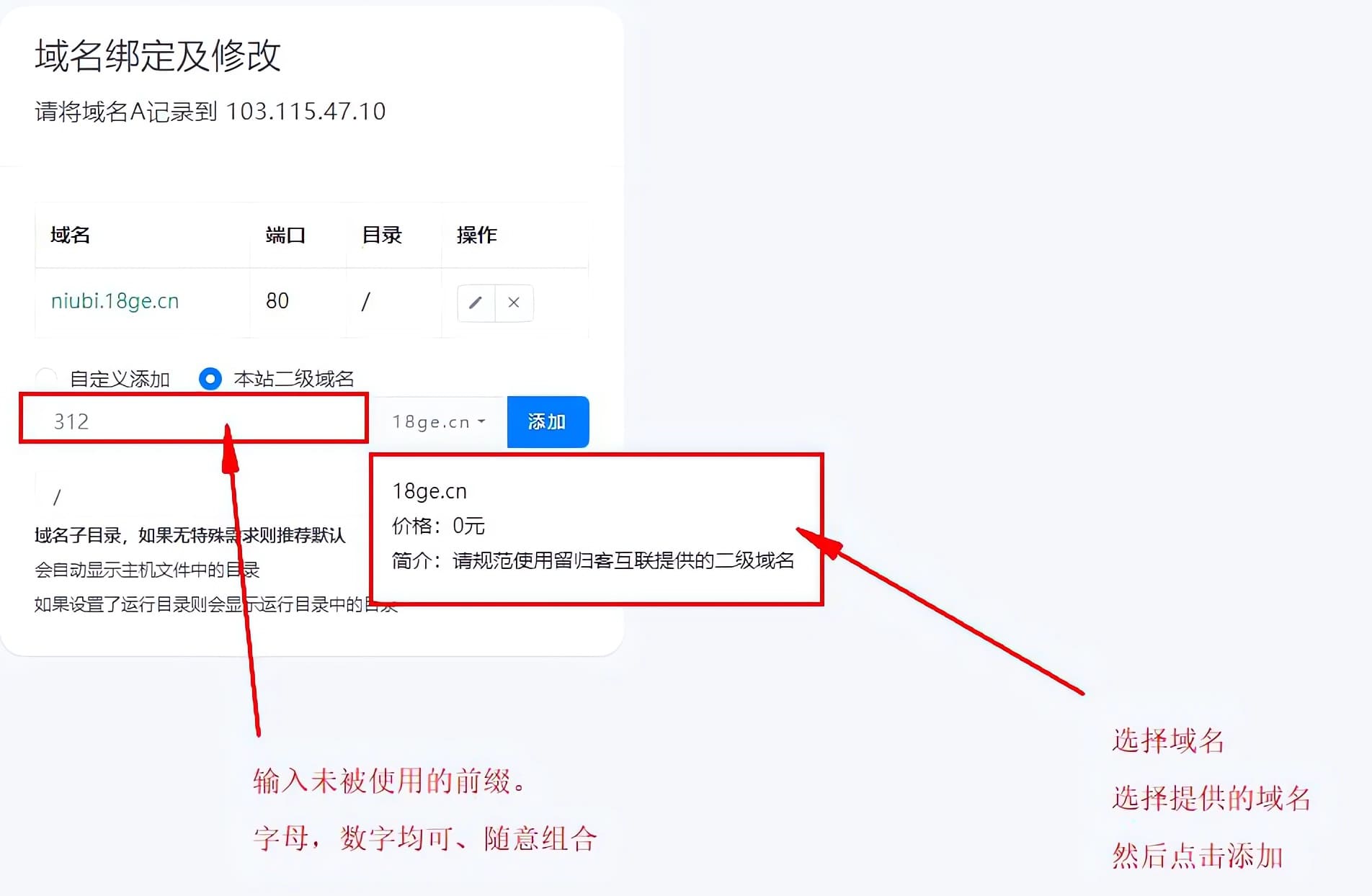 输入域名前缀,选择域名,点击添加。(字母数字随意组合)