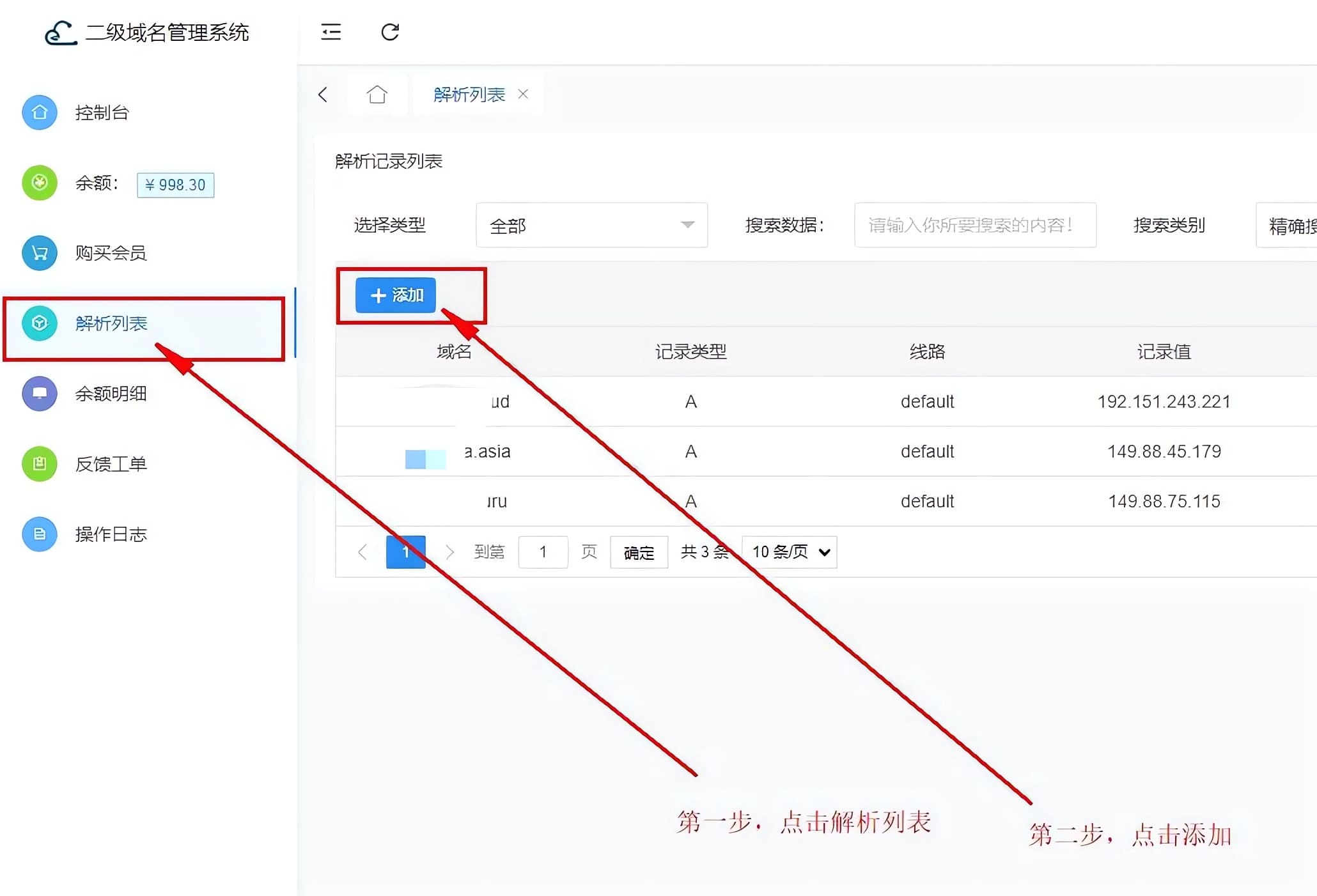3. 进入域名平台,如注册并登录本站二级域名分发站,选择解析列表,选择添加。