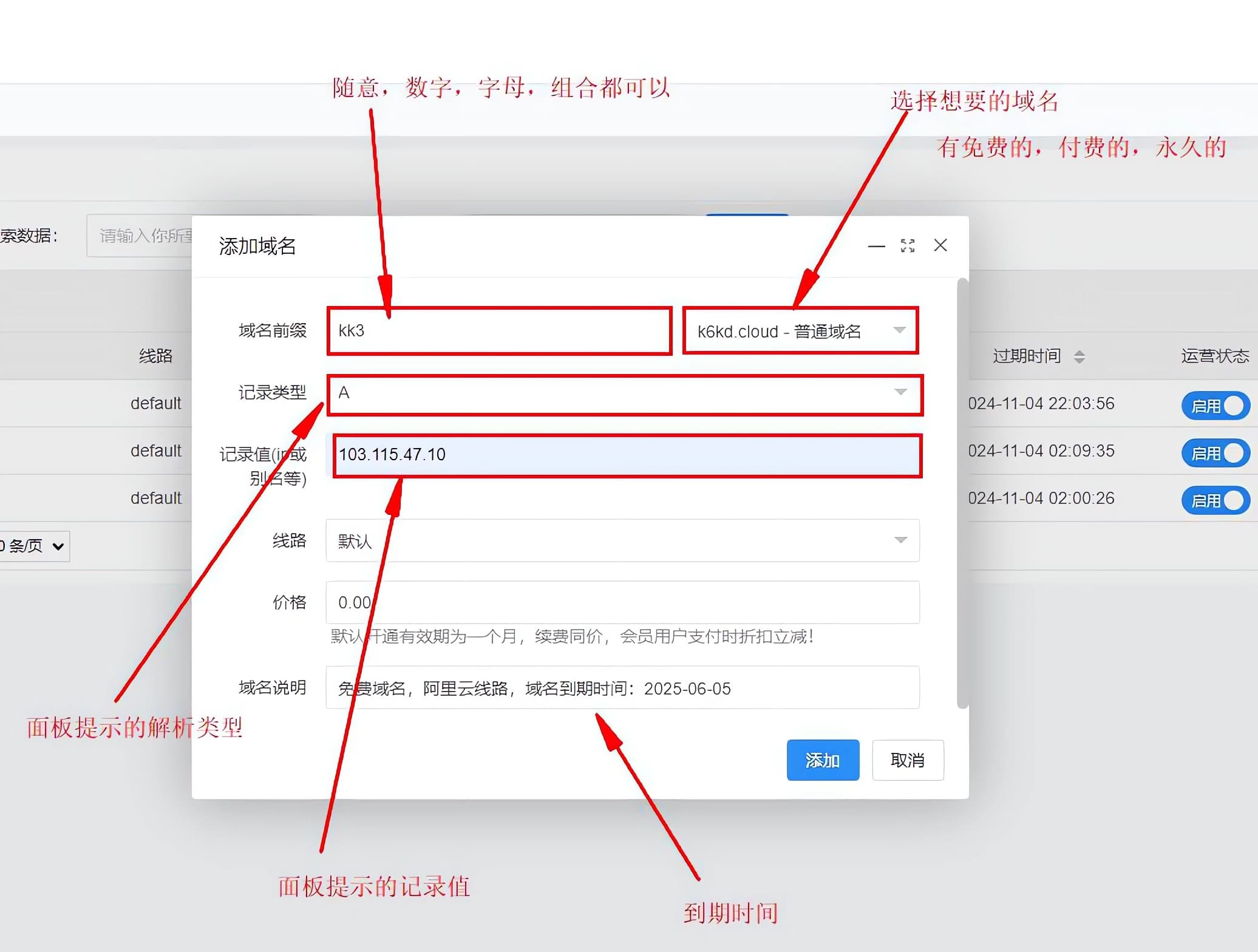 4. 输入域名前缀:如kk3 / 113 / 55 等,并选择域名,如这里选择k6kd.cloud域名。